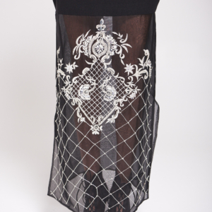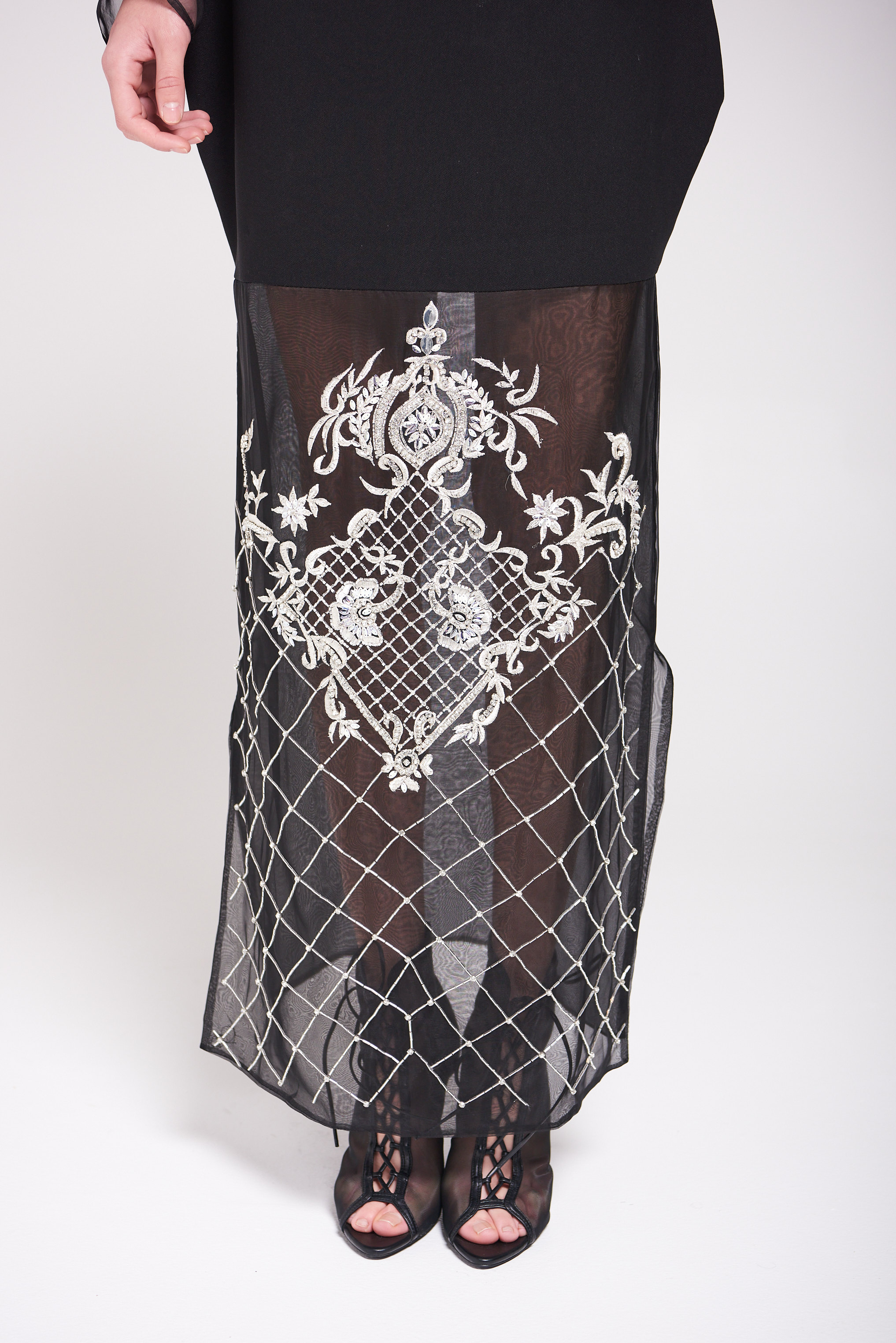 تتميّز التنورة بتفاصيل تطريز وشك يدوي تضيف لمسة فاخرة وأناقة مميزة
