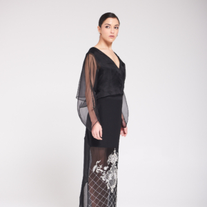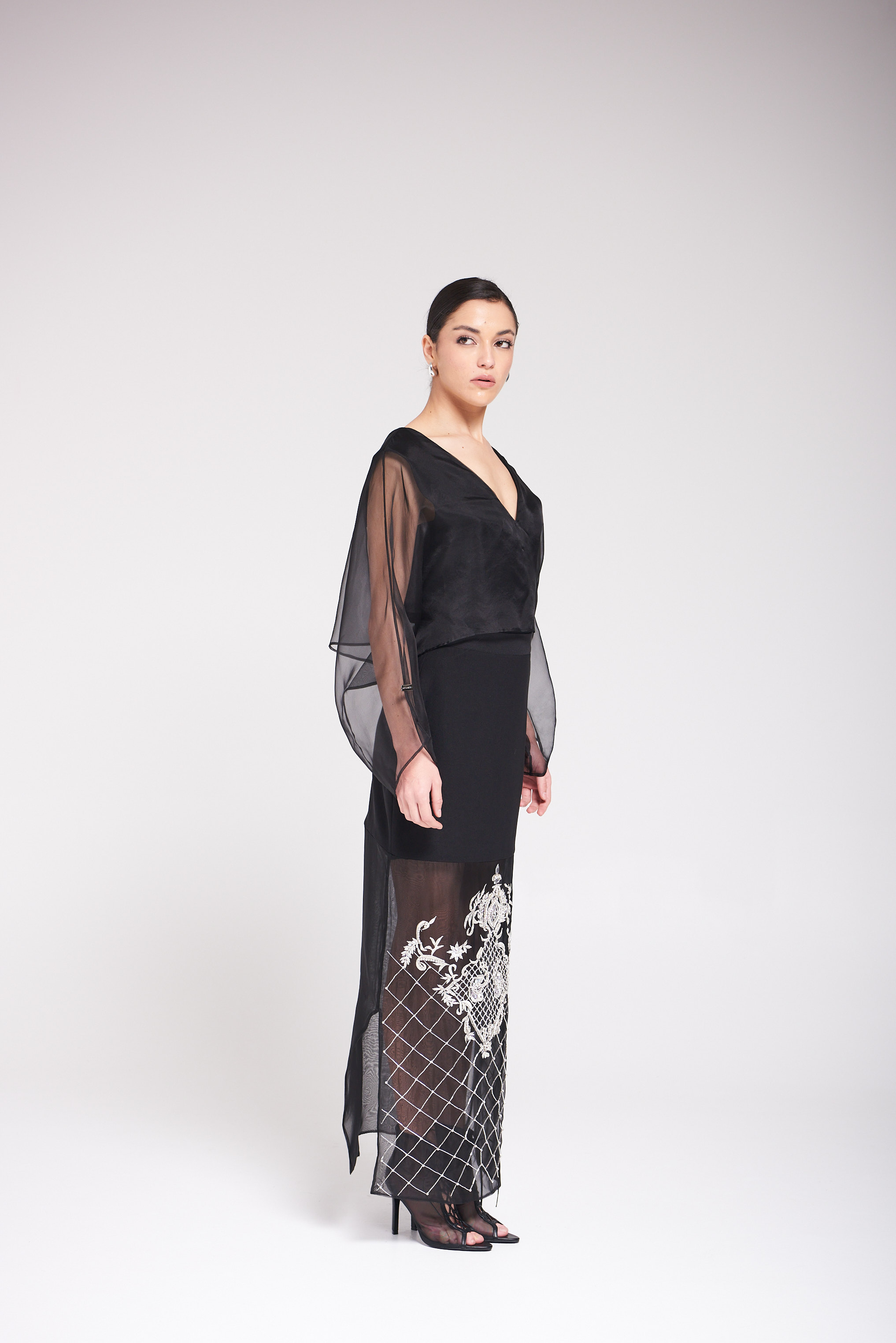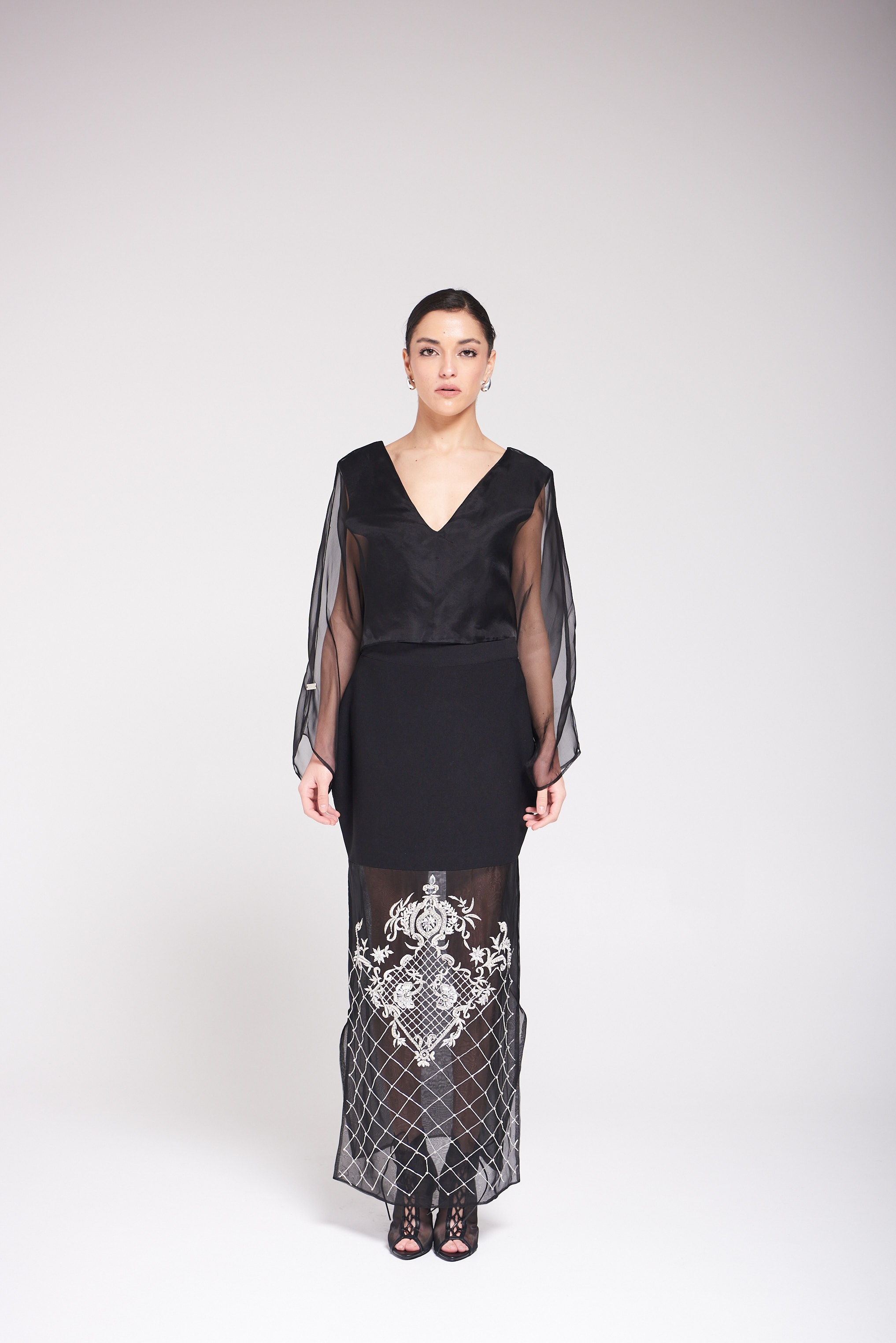 توب وتنورة، بتصميم يجمع بين خامتي الكريب والأورقنزا.
