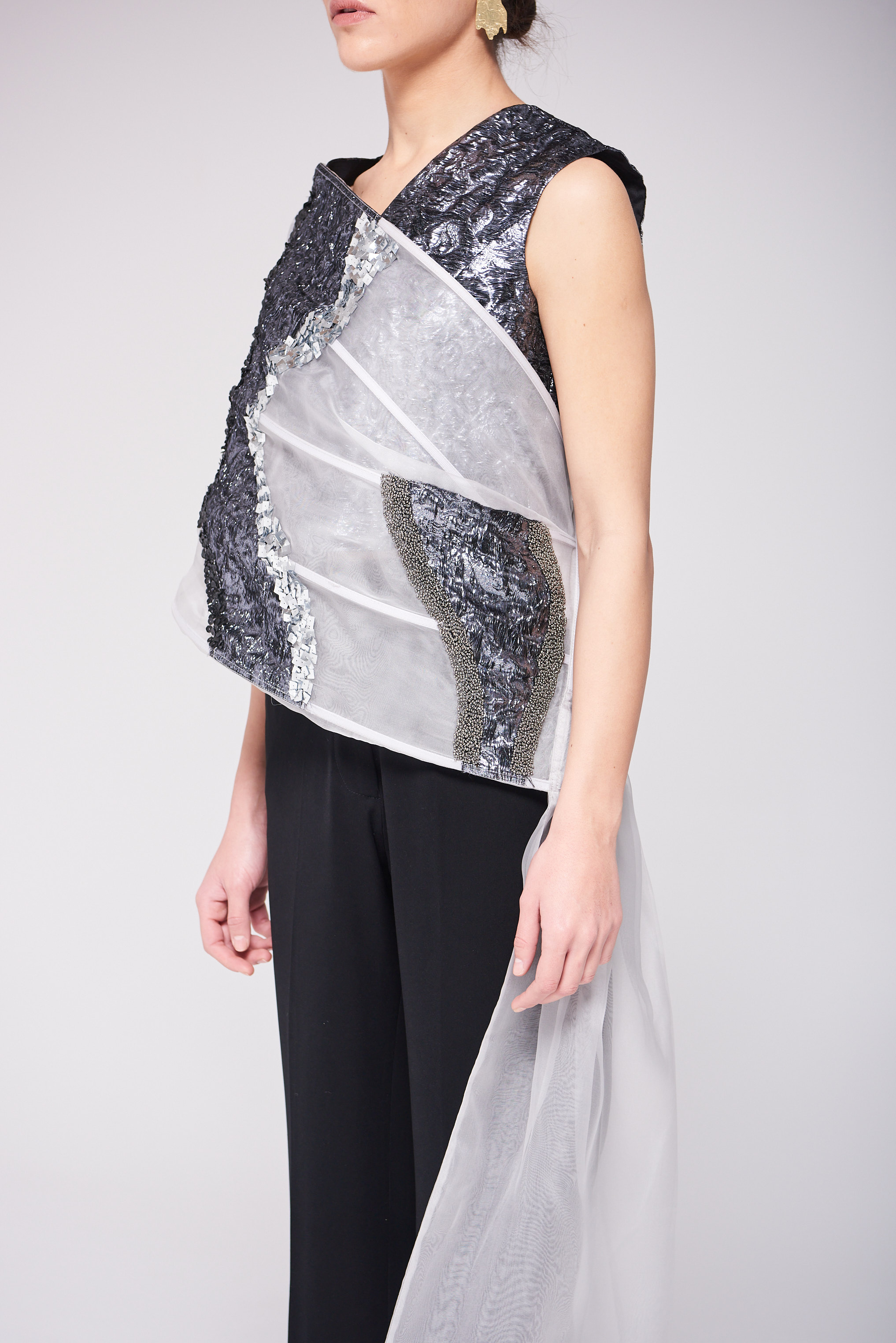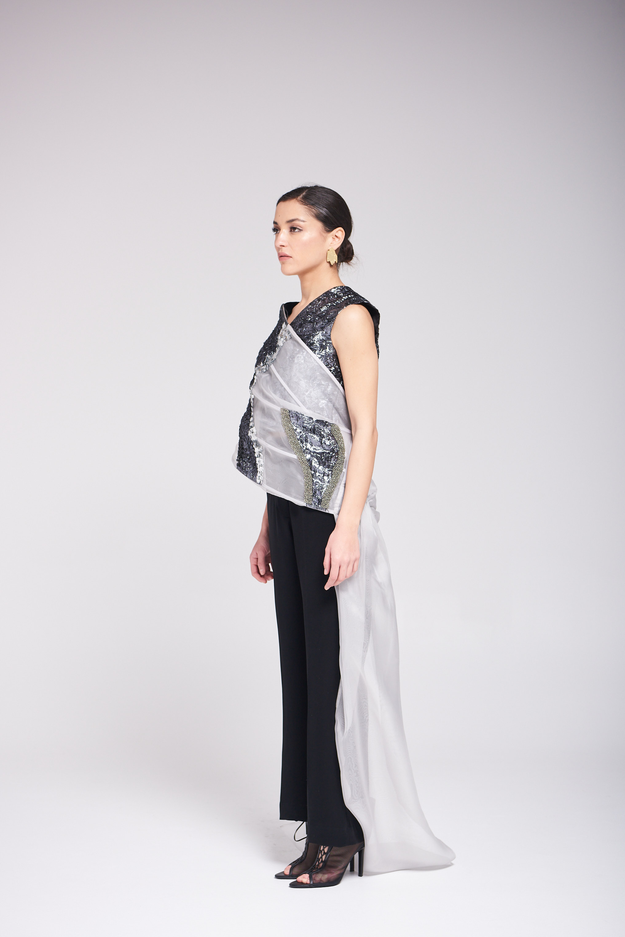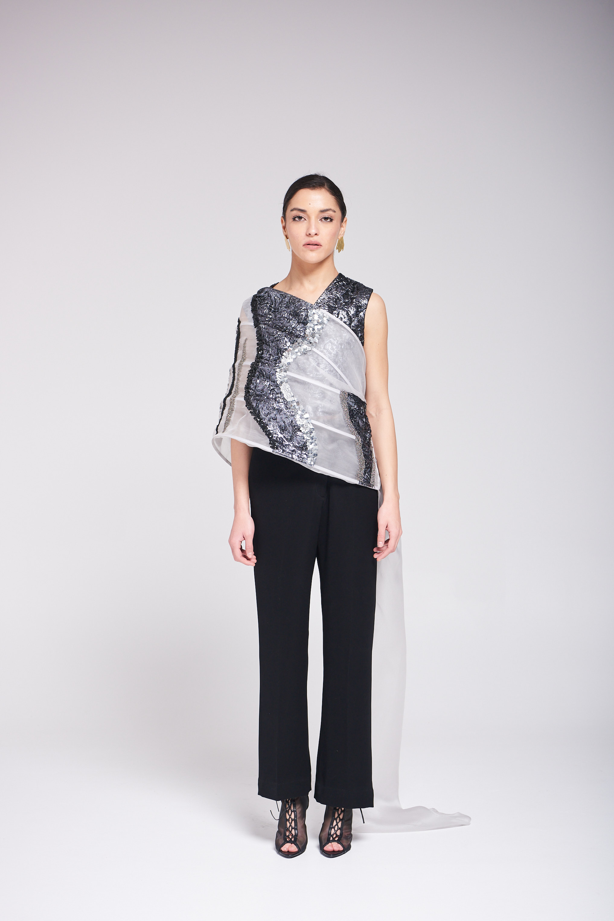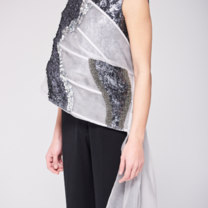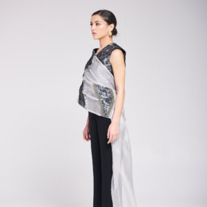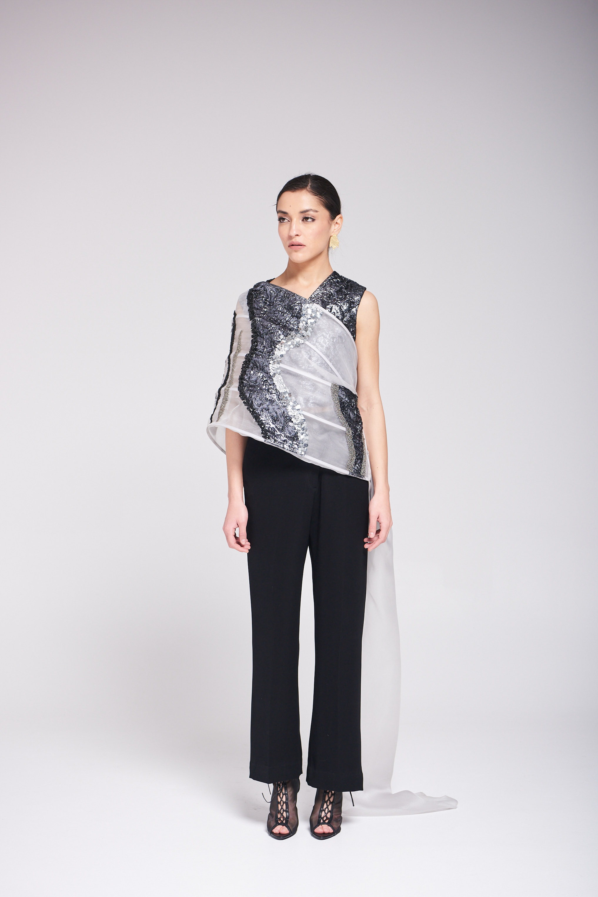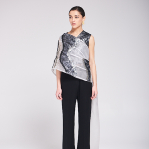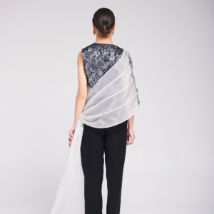 القطعة مكوّنة من توب وبنطلون بتصميم عصري وشال مكون من الاورقنزا ، يجمع بين خامة الأورقنزا والتفاصيل المطرزة والمشكوكة يدوياً، ليمنح الإطلالة لمسة فنية فاخرة