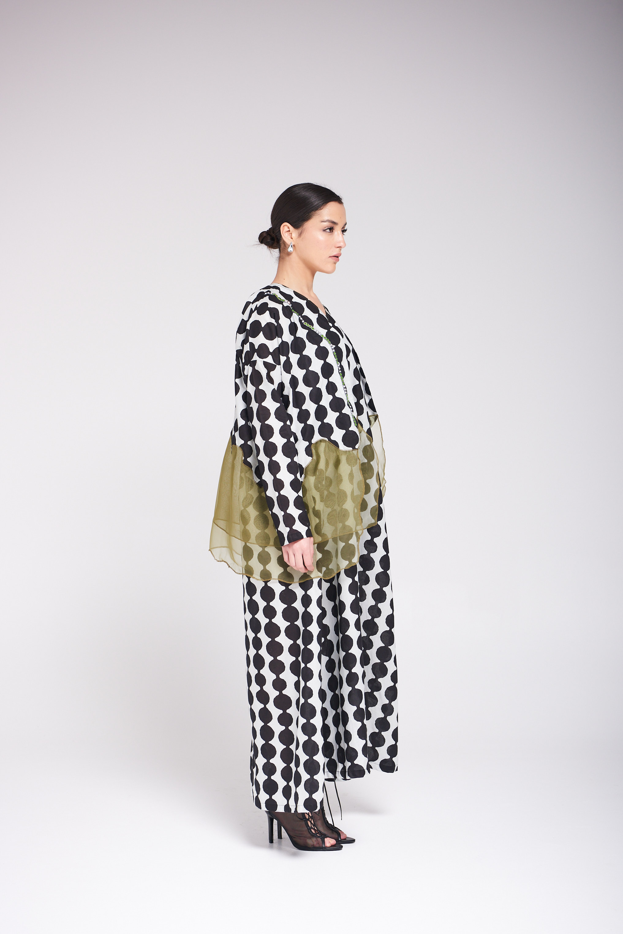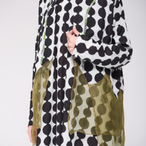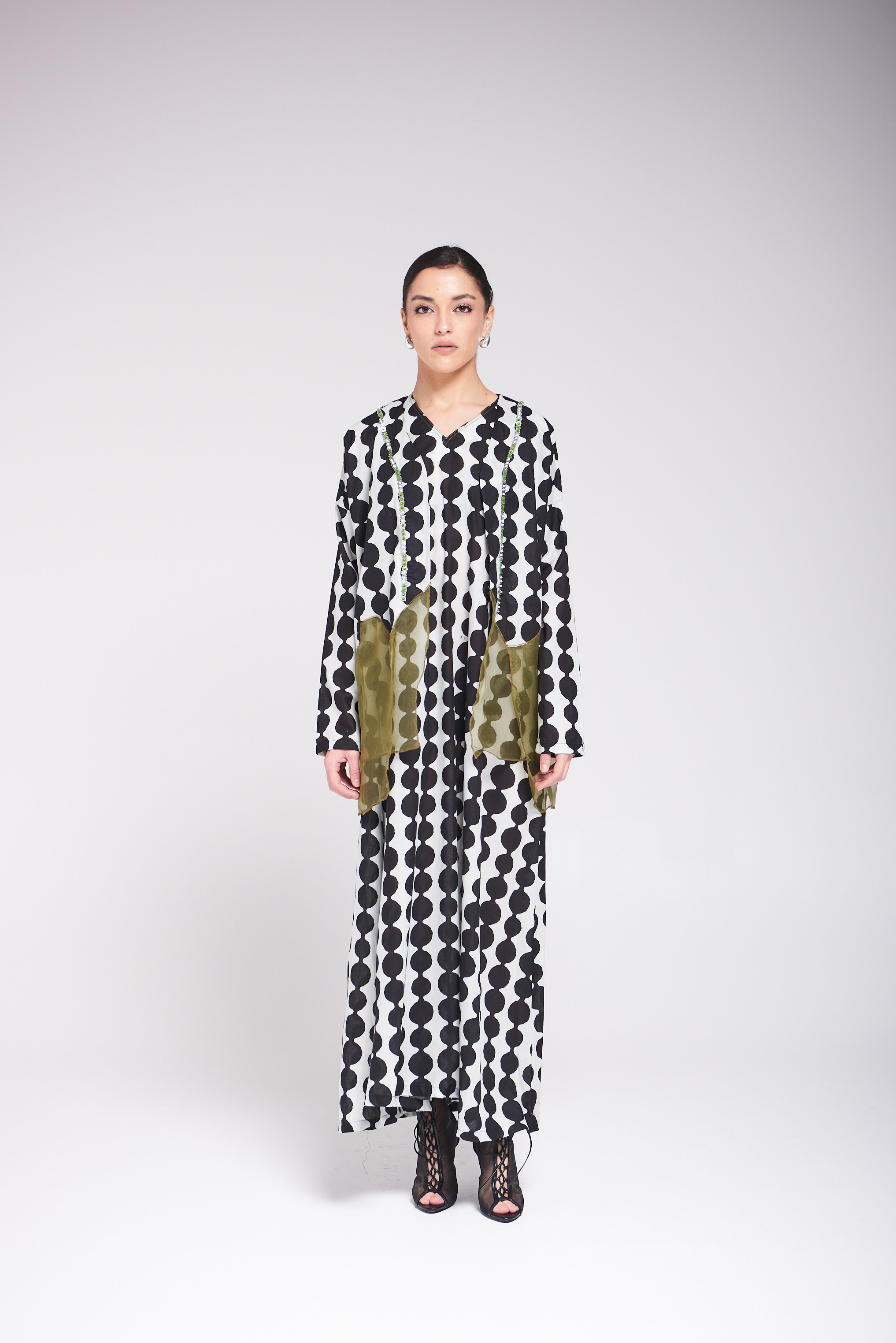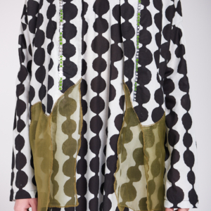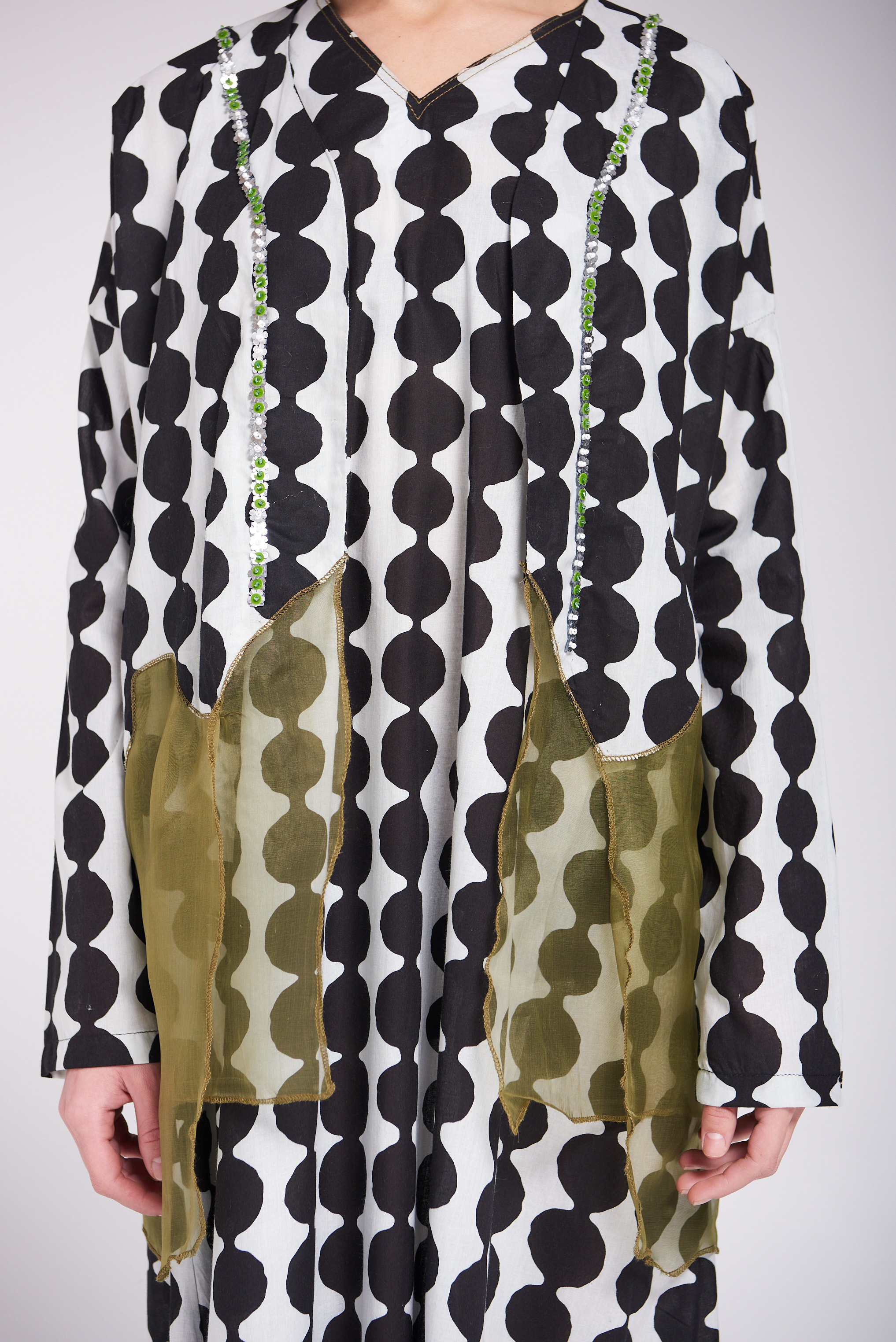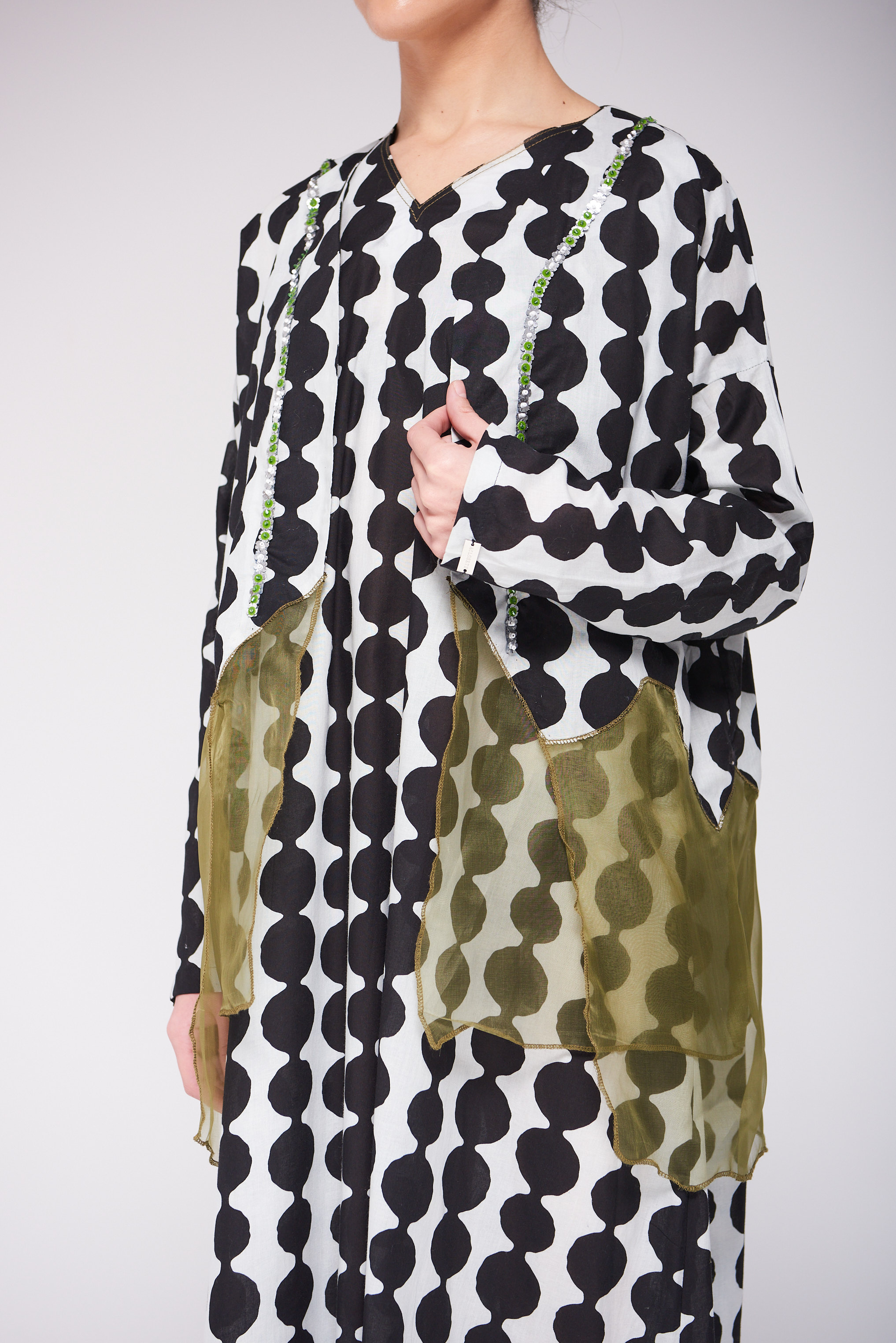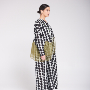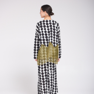 دراعة فضفاضة من القطن بنقشة عصرية بالأبيض والأسود، تتزين بتفاصيل أورجنزا بيور سيلك بدرجات الزيتوني ولمسات الشك اليدوية ناعمة تضيف للقطعة طابعاً فنياً أنيقاً